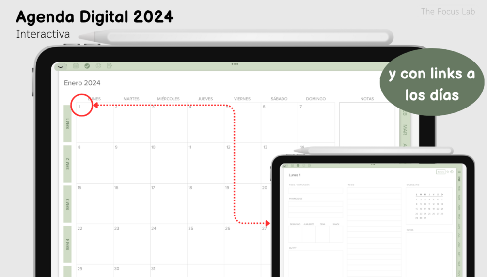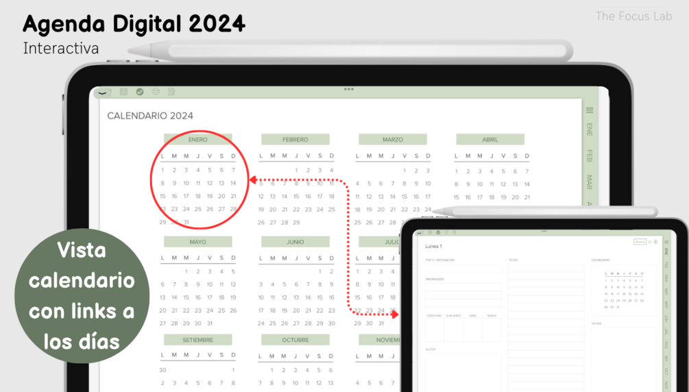 Organízate este 2024 con la Agenda Digital Interactiva 2024. Incluye links hacia todos los días, todas las semanas y todos los meses para hacer la navegación más fácil. Además incluye un zip de 123 stickers para que puedas decorar la agenda como más te guste.