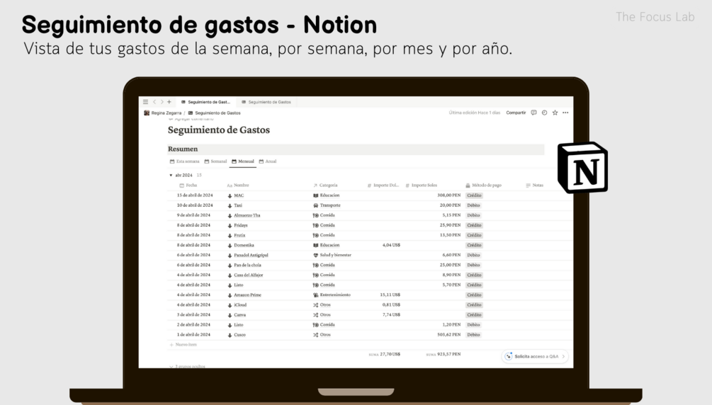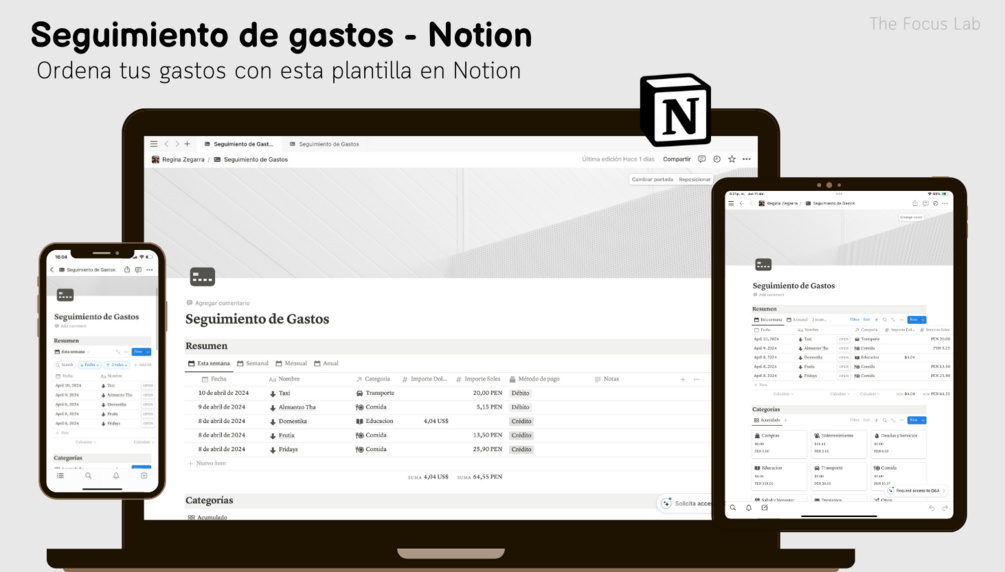 Organiza tus gastos con la plantilla "Seguimiento de Gastos" en Notion. Esta plantilla está diseñada para que sea tu asistente personal en temas de gastos. Con esta plantilla podrás llevar un seguimiento ordenado de tus gastos por semana, mes y año en dólares y soles (lo puedes cambiar a la moneda de tu país) y se agruparan automáticamente en categorías para que sepas en qué área gastas más dinero.